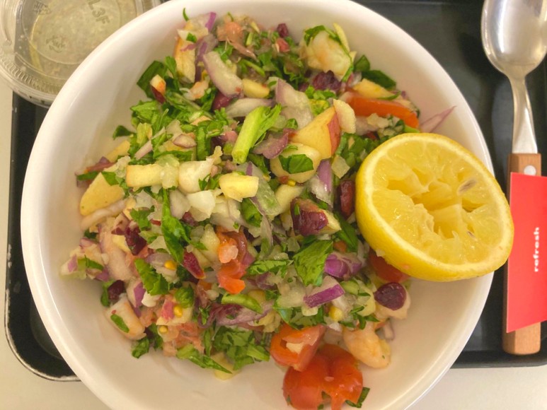 사과 토마토 새우 등등이 들어가있는 샐러드다.
