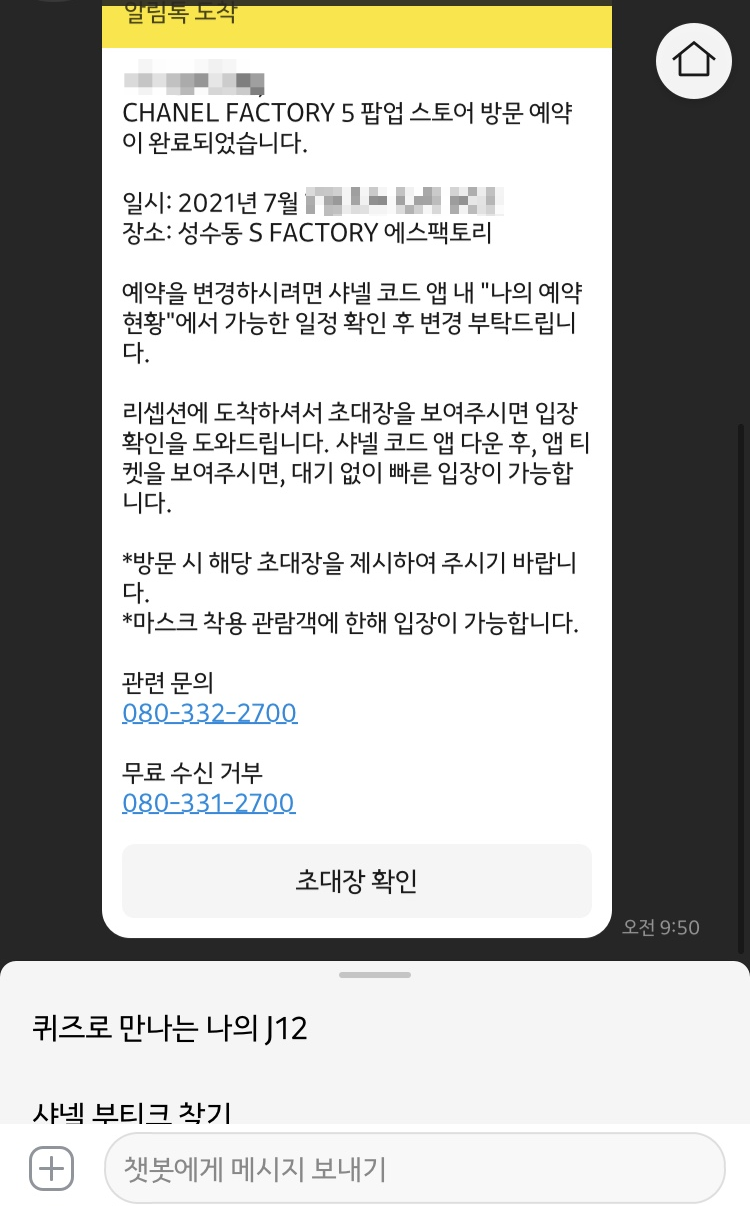 입장할 땐 요 카카오톡 메시지로