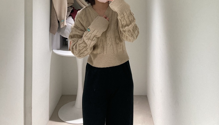 INSTANTFUNK 22F/W 브이넥 울 카라 케이블 니트 입니다. 크롭 기장감에 스트레이트하게 떨어지며, 드롭된 어깨와 루즈한 소매 실루엣으로 편안한 착용이 가능합니다. 부드러운 터치감의 원사를 사용