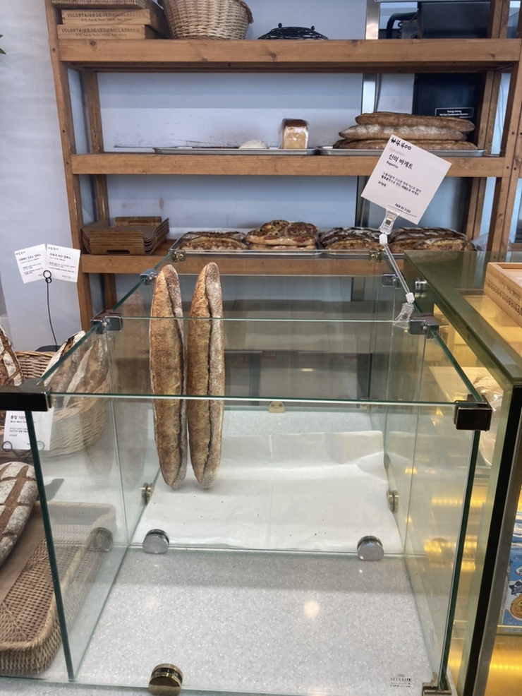 계산대 쪽으로 일렬은 바게트류, 사워도유류의 빵이 있고 꺾어서는 그 외의 페스츄리류 같은 일반 빵들이 진열되어있다.