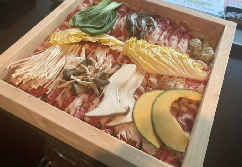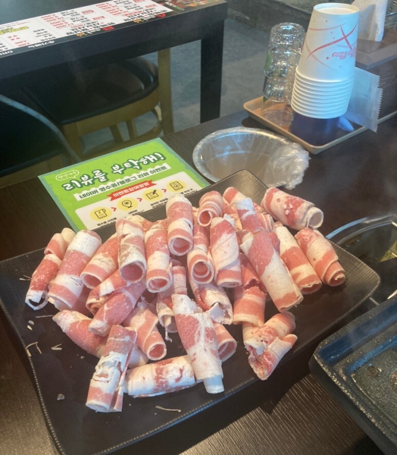 셀프바에서 샤브샤브 국물에 넣을 야채들과 고기를 가져왔다.