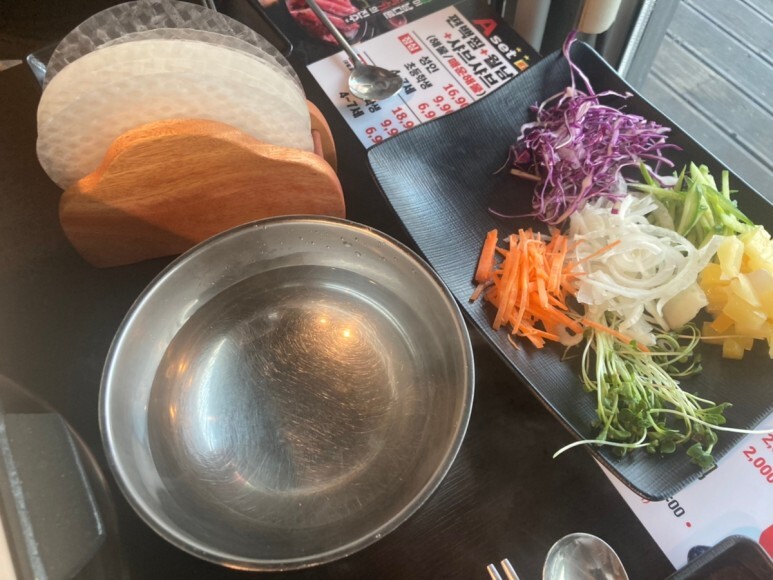 각종 야채 및 라이스페이퍼 적실 온수 먼저 떠와