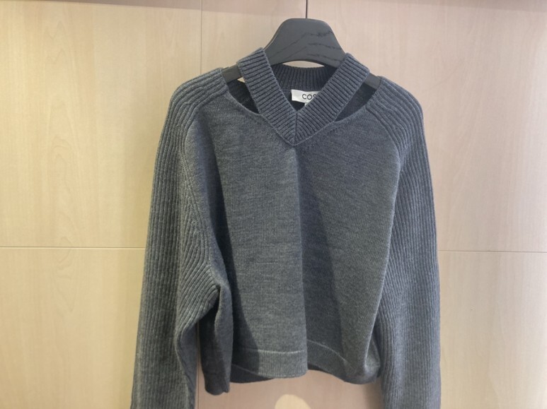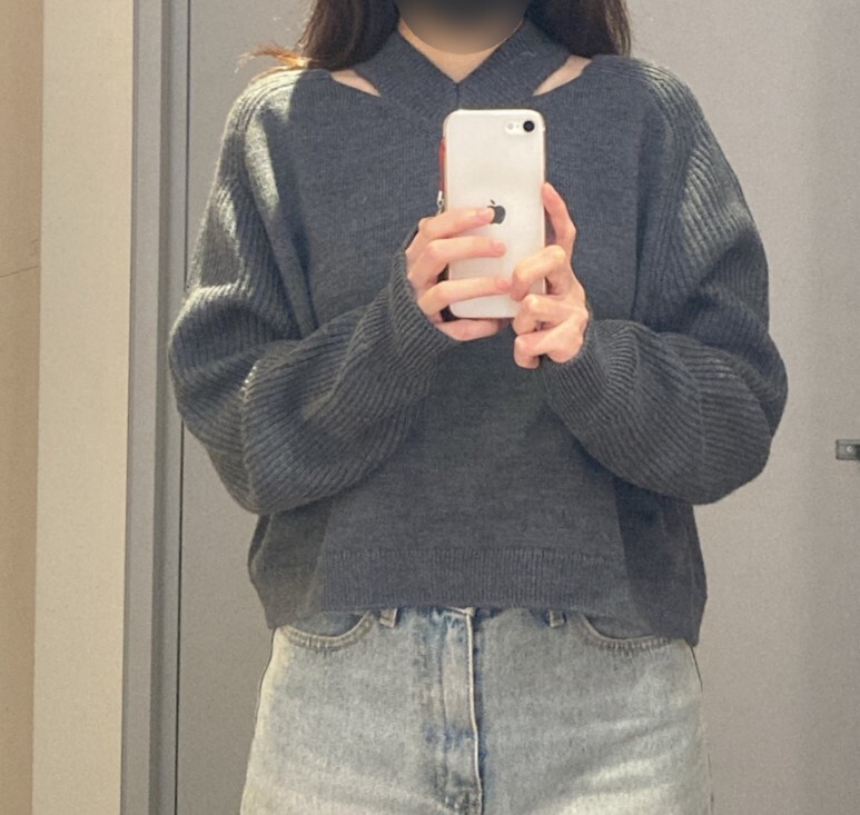 그리고 넥라인에 절개 포인트가 들어간 챠콜색 니트.