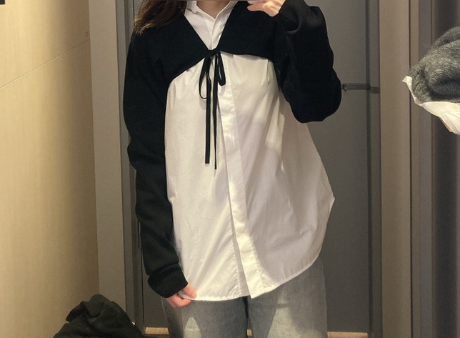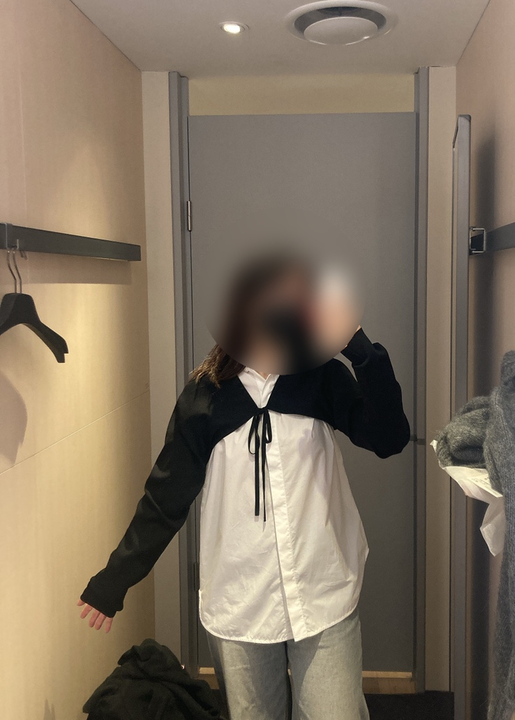 피팅해 본 제품은 총 4개인데 넥라인이 넓은 회색 크롭 가디건, 화이트 셔츠, 블랙 컬러 볼레로,