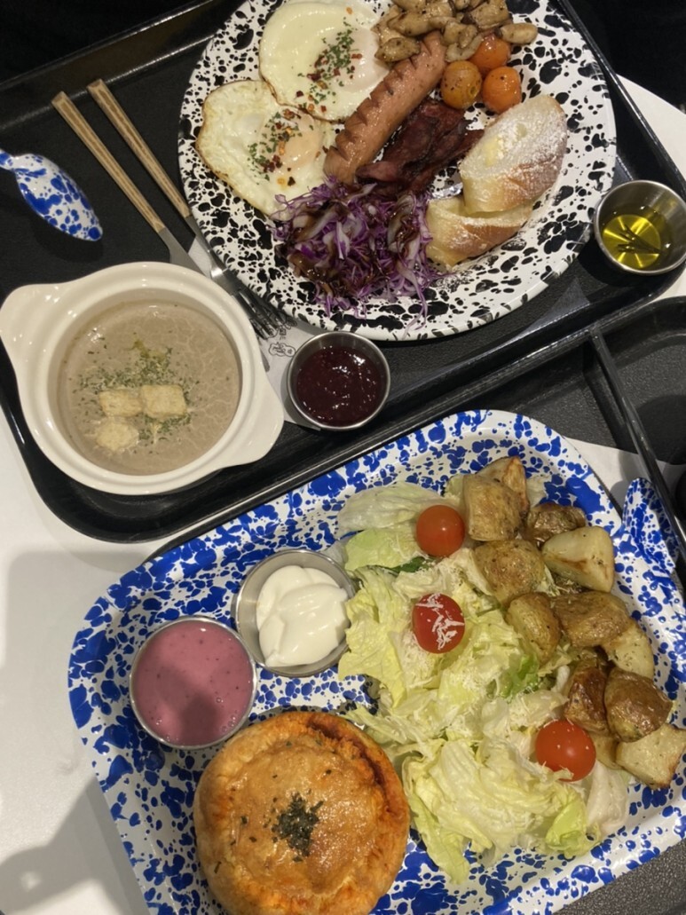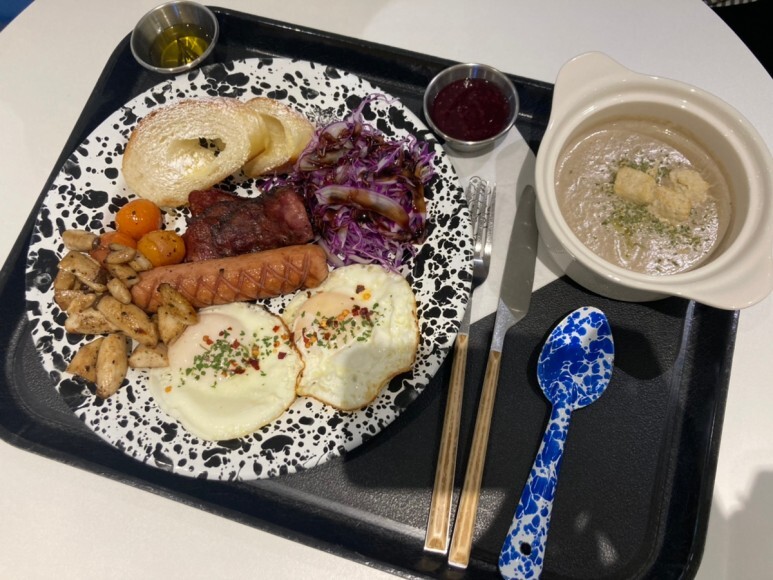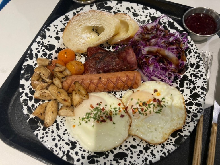잉글리시 브렉퍼스트는 계란후라이, 소시지, 베이컨, 빵, 구운 야채 등등이 나와