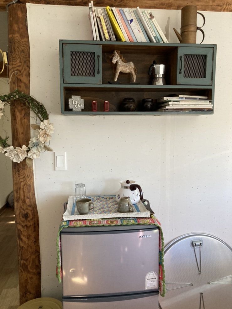 숙소 들어가면 바로 우측에 요런 주방 공간이 하나 있는데, 여기가 너무 아기자기하게 잘되어있어서 ㅠㅠ 그냥 막 찍어도 사진이 감성적으로 예쁘게 나온다.