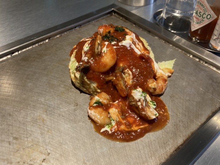 이미 주방에서 만들어져서 나온 오코노미야끼를 가져와