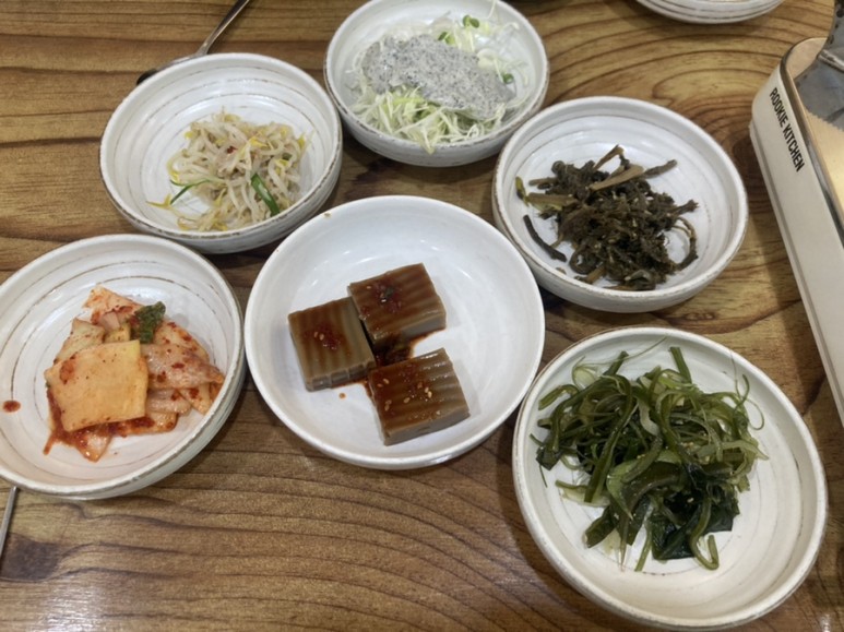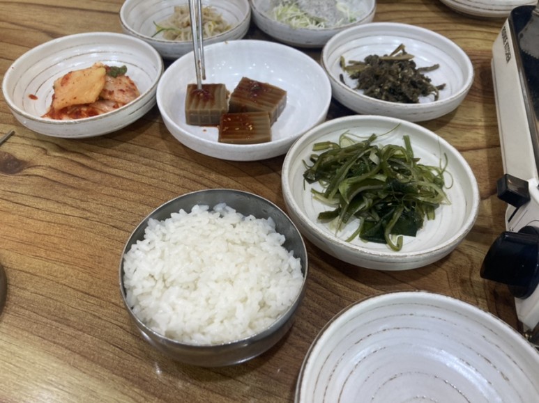 주문하고 먼저 차려진 밑반찬과 공기밥~