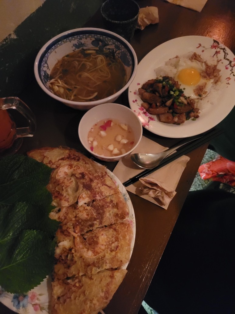 한국 음식으로 따지면 전이나 부침개 같은걸 깻잎에 같이 싸먹는 형태였다.