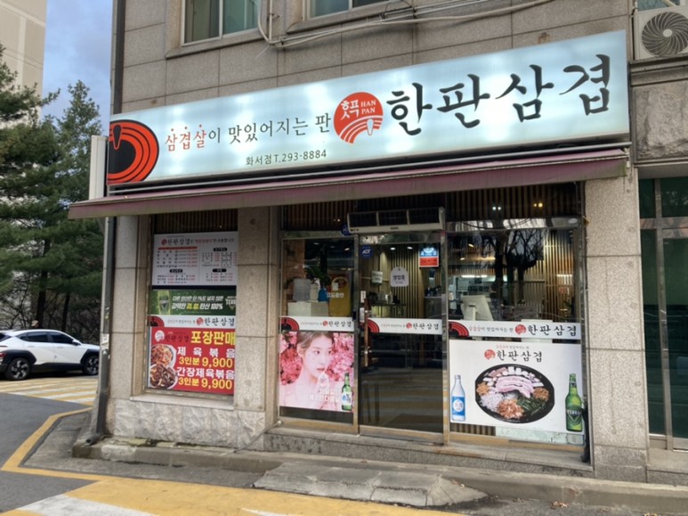 아파트 상가 쪽 코너에 위치한 한판삼겹.
