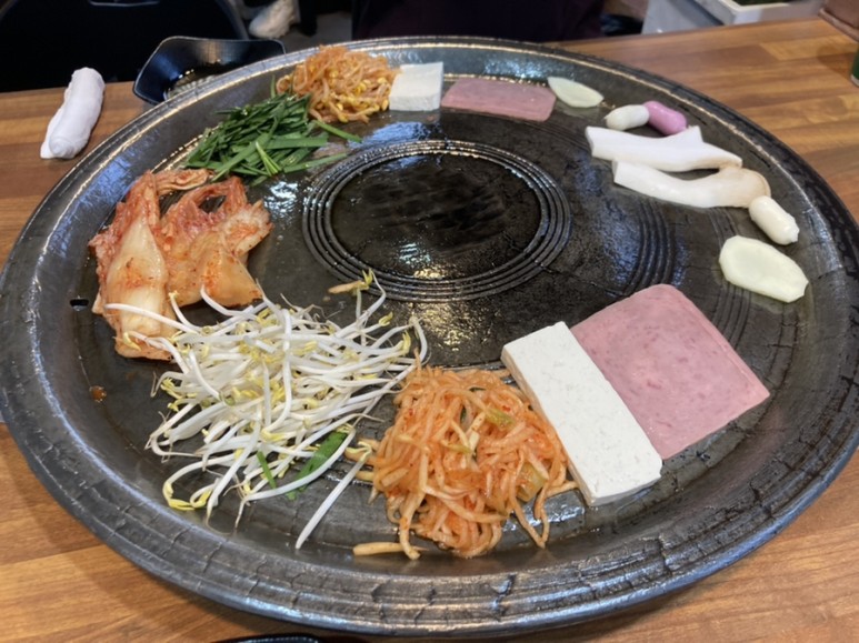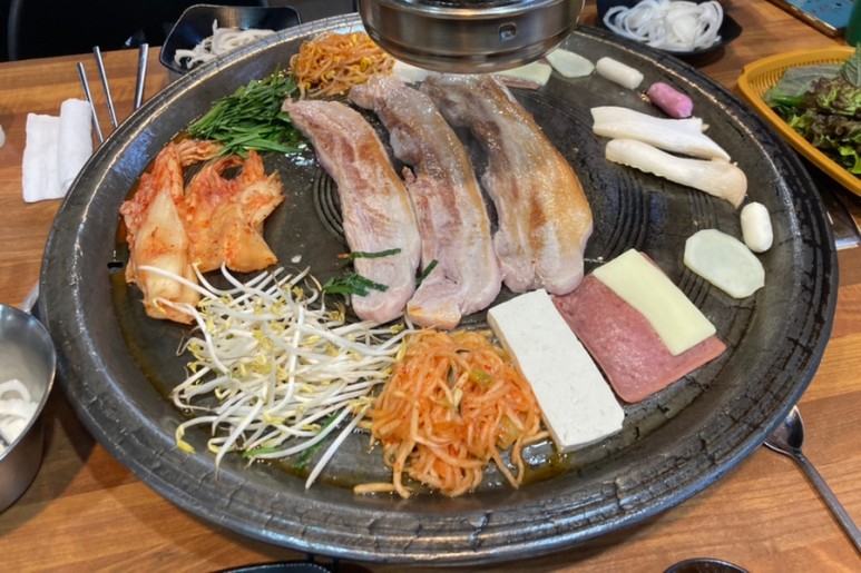 고기를 시키면 이렇게 기본적으로 치즈, 떡, 김치, 각종 야채 등등을 판에 먼저 올려주신다.