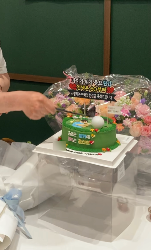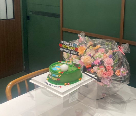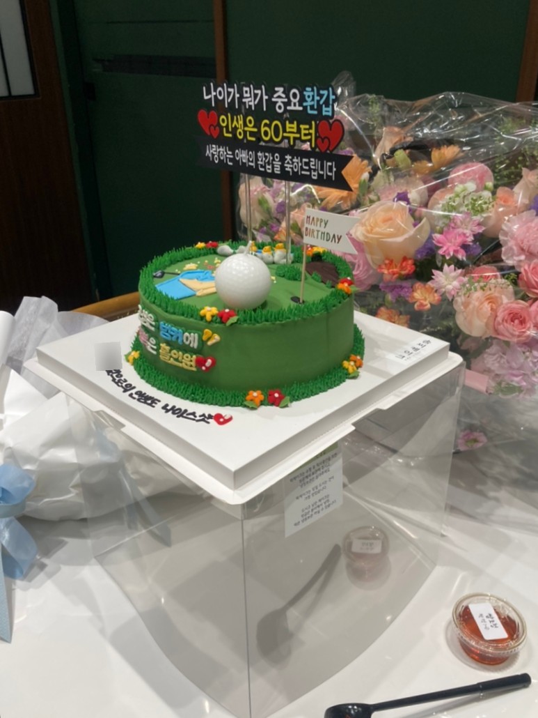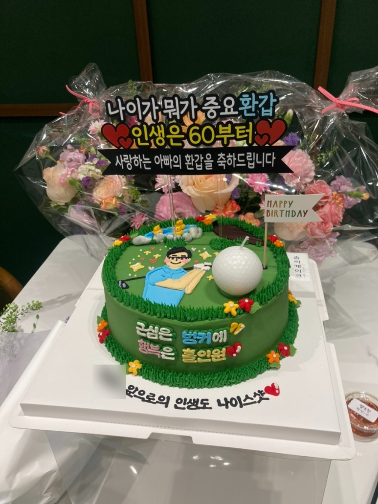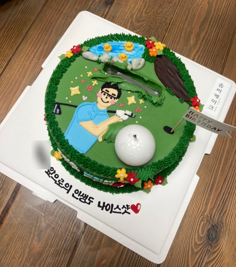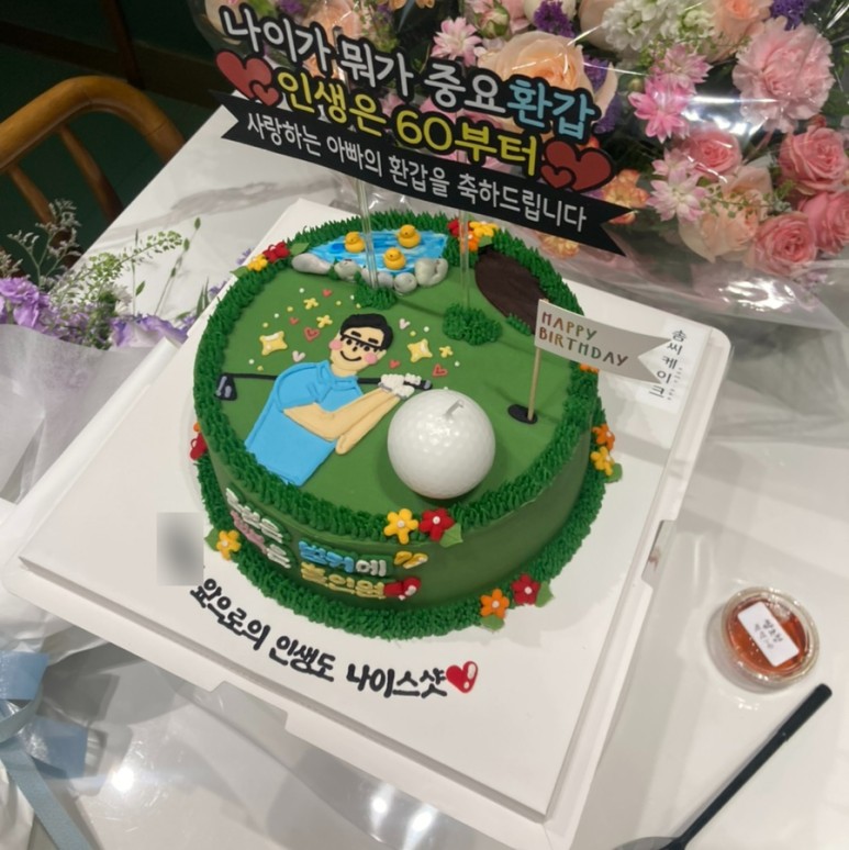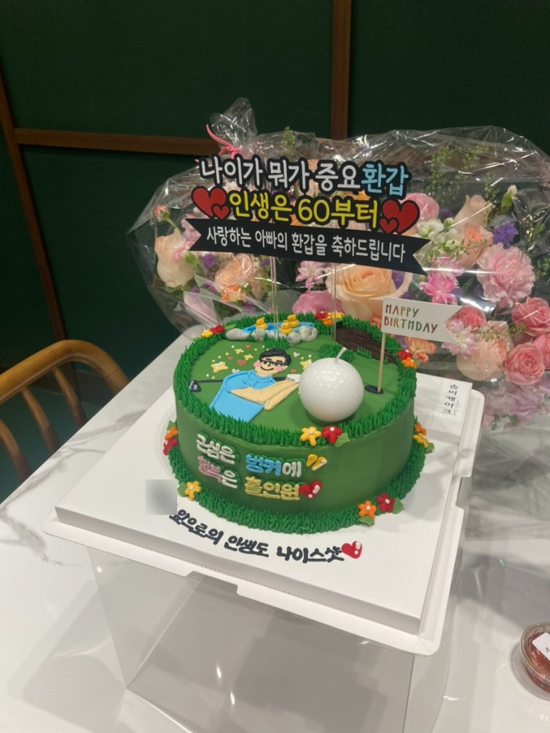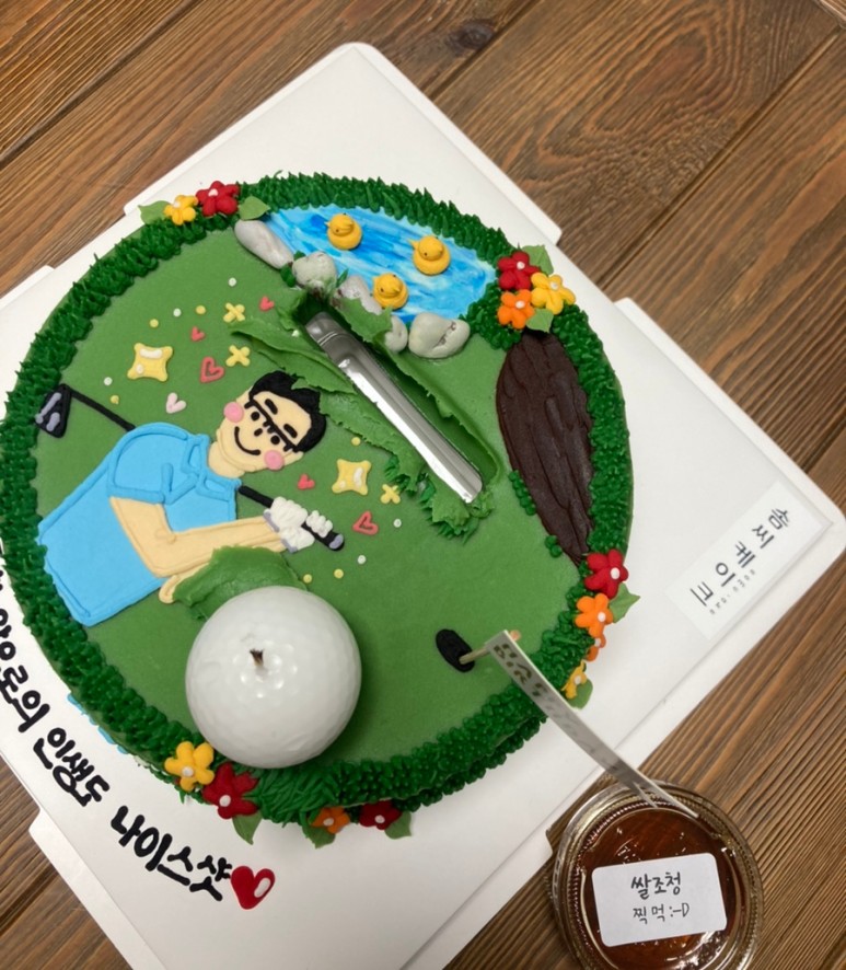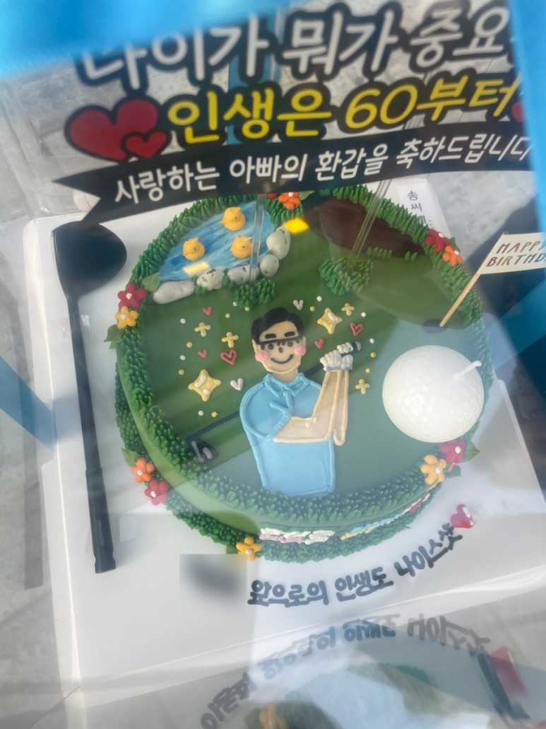케이크 디자인은 골프를 좋아하는 우리 아빠의 취향에 맞춰 골프 컨셉으로 주문했고ㅋㅋ 골프공 초랑 골프채까지 있는 버전으로 완성!