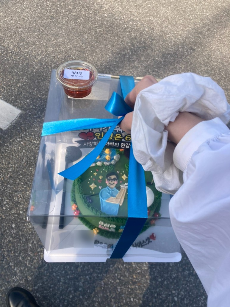 나는 일반 케이크가 아니라 용돈 케이크 (토퍼를 뽑으면 용돈이 나오는 형태)로 주문한거라 떡케이크에 토퍼가 꼽혀져 있다.