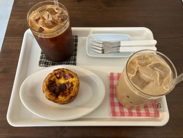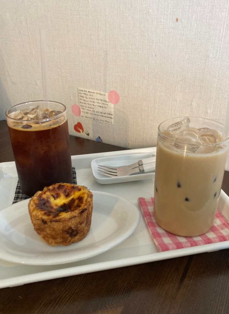 조금 기다리니 주문한 아이스 아메리카노, 에그타르트, 그리고 이 집 시그니처라는 아이스 바닐라 라떼가 나왔다.