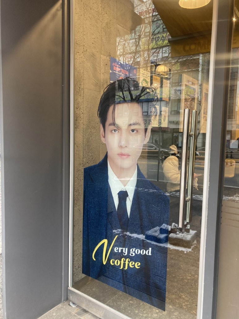문 앞에 걸린 뷔가 너무 잘생겼어요. (진지)